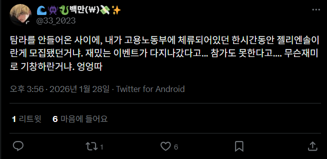 행정적인 일 때문에 한동안 정신이 없었어요. 진짜로 정신이 없어서, 그 사이에 온라인을 못 보고 있었는데. 그러다 들어가 보니까 참여 안 하면 그대로 못 가질 뻔한 판이 벌어져 있